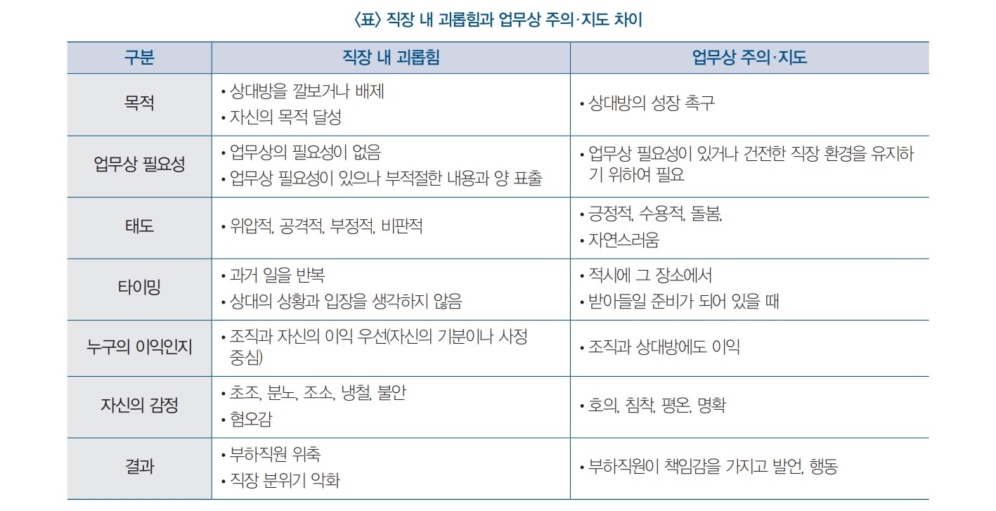 Á¶Á÷ »ýȰ¿¡¼ »ó±ÞÀÚÀÇ ÇϱÞÀÚ¿¡ ´ëÇÑ Áöµµ ¹× ÁÖÀÇ´Â ÇʼöÀûÀ̸ç, ¸¸¾à Á÷Àå ³» ±«·ÓÈû¿¡ ´ëÇÑ ¿ì·Á·Î ÀÎÇØ ÀûÁ¤ÇÑ Áöµµ µîÀÌ ÀÌ·ç¾îÁöÁö ¾Ê´Â °æ¿ì ÇØ´ç Á¶Á÷ÀÇ °Ç¼³ÀûÀÎ ¹ßÀüÀ» ±â´ëÇϱâ´Â ¾î·Á¿ï °ÍÀÌ´Ù. ±Ù·Î±âÁعý ¿ª½Ã ÀÌ·¯ÇÑ °Ç¼³Àû ÁÖÀÇ ¹× Áöµµ µî±îÁö ¹æÁöÇϰíÀÚ Á÷Àå ³» ±«·ÓÈûÀ» µµÀÔÇÑ °ÍÀº ¾Æ´Ï¹Ç·Î »ó±ÞÀÚ´Â À§ ±âÁØÀ» ÃæºÐÈ÷ ¾çÁöÇØ ÀûÁ¤ ¹üÀ§ÀÇ Áöµµ µîÀ» ÇÔÀ¸·Î½á º»ÀÎÀÇ ¼ÒÀÓÀ» ´ÙÇØ¾ß ÇÒ °ÍÀÌ´Ù.