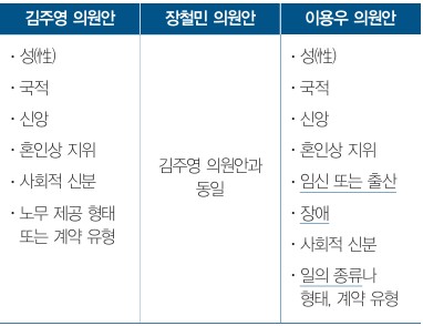 ÇöÀç ±¹È¸¿¡´Â ±èÁÖ¿µ ´õºÒ¾î¹ÎÁÖ´ç ÀÇ¿ø µî 10¸íÀÇ ÀÇ¿øÀÌ ¹ßÀÇÇÑ ÀÏÇÏ´Â »ç¶÷ ±âº»¹ý¾È(ÀÌÇÏ '±èÁÖ¿µ ÀÇ¿ø¾È'), Àåö¹Î ´õºÒ¾î¹ÎÁÖ´ç ÀÇ¿ø µî 11¸íÀÇ ÀÇ¿øÀÌ ¹ßÀÇÇÑ ÀÏÇÏ´Â »ç¶÷ÀÇ º¸È£ µî¿¡ °üÇÑ ¹ý·ü¾È(ÀÌÇÏ 'Àåö¹Î ÀÇ¿ø¾È') ¹× ÀÌ¿ë¿ì ´õºÒ¾î¹ÎÁÖ´ç ÀÇ¿ø µî 12¸íÀÇ ÀÇ¿øÀÌ ¹ßÀÇÇÑ ÀÏÇÏ´Â »ç¶÷ ±âº»¹ý¾È(ÀÌÇÏ 'ÀÌ¿ë¿ì ÀÇ¿ø¾È')ÀÌ »óÁ¤µÅ ÀÖ´Ù. À§ 3°³ ¹ý¾ÈÀº ¨çÁ¤ÀÇ, Àû¿ë ¹üÀ§, ´Ù¸¥ ¹ý·ü°úÀÇ °ü°è, °ü·Ã ÁÖüÀÇ Ã¥¹« µîÀ» ±ÔÁ¤ÇÏ´Â ÃÑÄ¢, ¨èÀÏÇÏ´Â »ç¶÷ÀÇ ³ë¹« Á¦°ø Á¶°Ç¿¡ °üÇÑ ³ë¹« °ø±Þ Á¶°ÇÀÇ º¸È£, ¨é³ëµ¿ºÎ Àå°üÀÇ Áöµµ ¹× °¨µ¶, ¨ê±× ¹ÛÀÇ °ü·Ã ±ÔÁ¤À» ´ãÀº º¸Ä¢, ¨ë½ÇÈ¿¼º È®º¸¸¦ À§ÇÑ ¹úÄ¢À¸·Î ±× ±¸¼ºÀº ´ëµ¿¼ÒÀÌÇÏÁö¸¸, ¼¼ºÎÀûÀ¸·Î´Â Â÷À̰¡ ÀÖ´Ù.