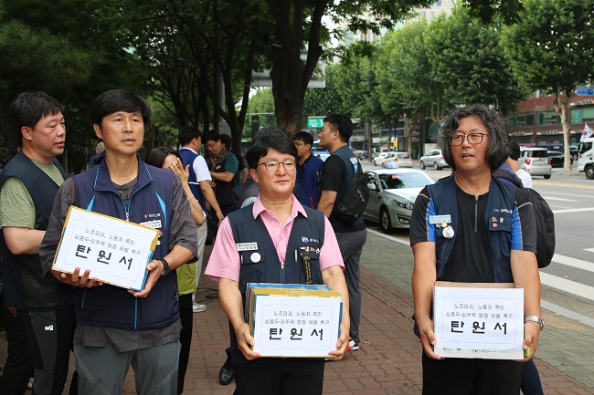 ¡ã8¿ù 13ÀÏ ¿ÀÀü 11½Ã ¼¿ï ¾çõ±¸ ¼¿ï³²ºÎÁö¹æ¹ý¿ø ¾Õ¿¡¼ ¿¸° '³ëÁ¶ÆÄ±«¹ü ½ÉÁ¾µÎ ¾öÁ¤Ã³¹úÃ˱¸ ÇÇÇØÀÚ ±âÀÚȸ°ß' Á÷ÈÄ ³ëÁ¶Ãø ÀλçµéÀÌ ÀçÆÇºÎ¿¡ Àü´ÞÇÒ Åº¿ø¼¸¦ µé°í ÀÖ´Ù.