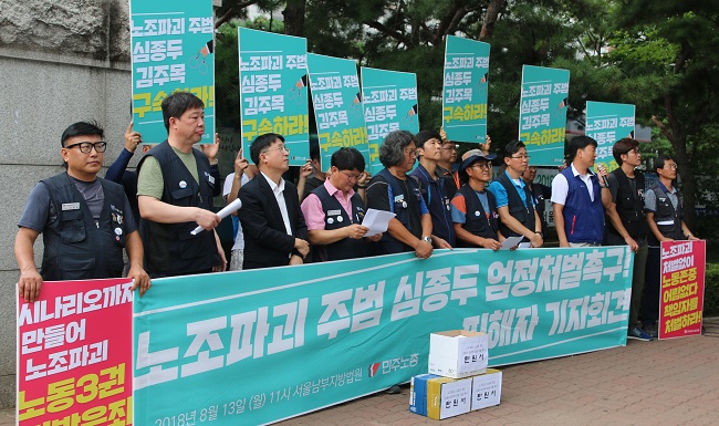 8¿ù 13ÀÏ ¿ÀÀü 11½Ã ¹ÎÁÖ³ëÃÑÀº ¼¿ï ¾çõ±¸ ¼¿ï³²ºÎÁö¹æ¹ý¿ø ¾Õ¿¡¼ ±âÀÚȸ°ßÀ» ¿¾ú´Ù. À̳¯ ±âÀÚȸ°ß¿¡¼´Â ³ëÁ¶ ÆÄ±« ÀÇȤÀ» ¹Þ°í ÀÖ´Â ½ÉÁ¾µÎ Àü âÁ¶ÄÁ¼³ÆÃ ´ëÇ¥(Çö ±Û·Î¹ú¿ø ´ëÇ¥)ÀÇ ¾öÁ¤ÇÑ ½ÉÆÇÀ» Ã˱¸ÇÏ´Â ÇÇÇØÀÚµéÀÇ ¹ß¾ðÀÌ ÀÕµû¶ú´Ù.