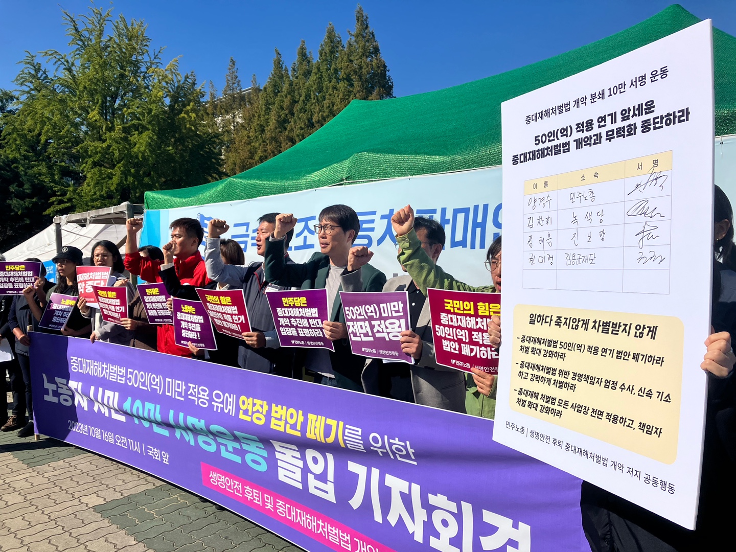 ¡ãÀü±¹¹ÎÁֳ뵿Á¶ÇÕÃÑ¿¬¸ÍÀº 16ÀÏ ¿ÀÀü ¼¿ï ¿©Àǵµ ±¹È¸ ¾Õ¿¡¼ 'Áß´ëÀçÇØÃ³¹ú¹ý 50ÀÎ(¾ï) ¹Ì¸¸ Àû¿ë À¯¿¹ ¿¬Àå ¹ý¾È Æó±â¸¦ À§ÇÑ ³ëµ¿ÀÚ¤ý½Ã¹Î 10¸¸ ¼¸í¿îµ¿ µ¹ÀÔ ±âÀÚȸ°ß'À» ¿¾ú´Ù. (ÀÌÀçÇå ±âÀÚ jh59@)