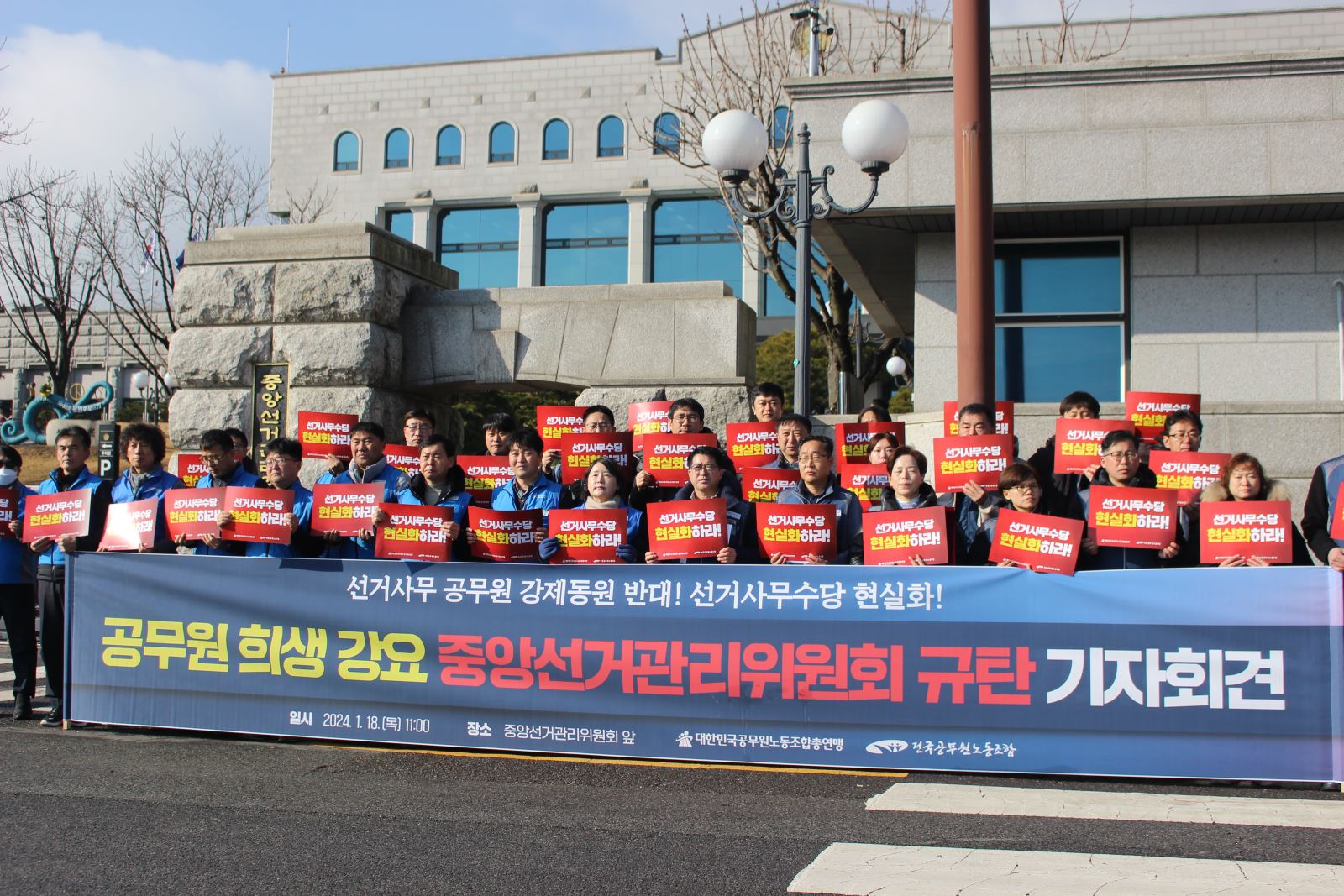¡ãÀü±¹°ø¹«¿ø³ëµ¿Á¶ÇÕ°ú ´ëÇѹα¹°ø¹«¿ø³ëµ¿Á¶ÇÕÃÑ¿¬¸ÍÀº Áö³ 18ÀÏ ¿ÀÀü °æ±âµµ °úõ½Ã Áß¾Ó¼±°üÀ§ ¾Õ¿¡¼ '°ø¹«¿ø Èñ»ý °¿ä Áß¾Ó¼±°Å°ü¸®À§¿øÈ¸ ±Ôź ±âÀÚȸ°ß'À» ¿¾ú´Ù. (ÀÌÀçÇå ±âÀÚ jh59@)