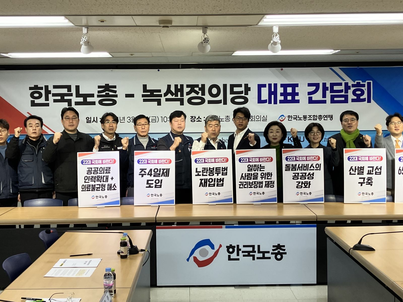 ¡ãÇѱ¹³ëµ¿Á¶ÇÕÃÑ¿¬¸Í°ú ³ì»öÁ¤ÀÇ´çÀÌ 8ÀÏ ¿ÀÀü ¼¿ï ¿©Àǵµ Çѱ¹³ëÃÑ ´ëȸÀǽǿ¡¼ 'Çѱ¹³ëÃÑ ³ì»öÁ¤ÀÇ´ç ´ëÇ¥ °£´ãȸ'¸¦ ¿¾ú´Ù.(ÀÌÀçÇå ±âÀÚ jh59@)