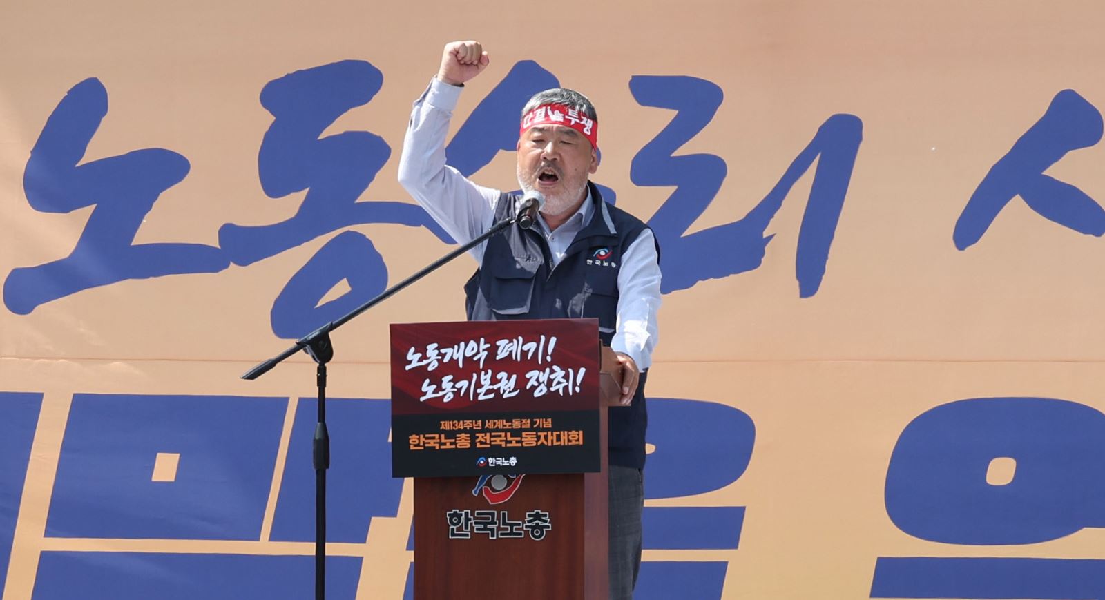 ¡ã±èµ¿¸í Çѱ¹³ëµ¿Á¶ÇÕÃÑ¿¬¸Í(Çѱ¹³ëÃÑ) À§¿øÀåÀÌ Áö³ 5¿ù 1ÀÏ ¿¸° 'Çѱ¹³ëÃÑ Àü±¹³ëµ¿ÀÚ´ëȸ'¿¡¼ ¹ß¾ðÇϰí ÀÖ´Ù. (»çÁø=´º½Ã½º)