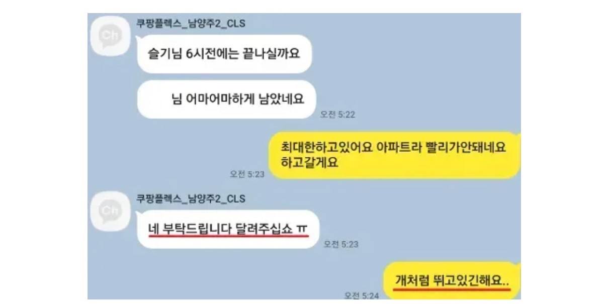 ƯÈ÷, Áö³ 5¿ù ÄíÆÎCLS¿¡¼ ¹è¼Û±â»ç·Î ÀÏÇÏ´Ù ¼ûÁø Á¤½½±â ¾¾¿Í °ü·ÃÇØ ÄíÆÎCLS Á÷¿øÀÌ Á¤ ¾¾¿¡°Ô º¸³½ īī¿ÀÅå ¸Þ½ÃÁö°¡ °ø°³µÇ¸é¼ ºÒ¹ýÆÄ°ß ÀÇȤÀÌ Á¦±âµÆ´Ù. ÇØ´ç ¸Þ½ÃÁö¿¡ µû¸£¸é Á÷¿øÀº Á¤ ¾¾¿¡°Ô "(¹è¼Û »óǰÀÌ) ¾î¸¶¾î¸¶ÇÏ°Ô ³²¾Ò´Ù"¸ç ºü¸¥ ¹è¼ÛÀ» ¿ä±¸Çß´Ù.