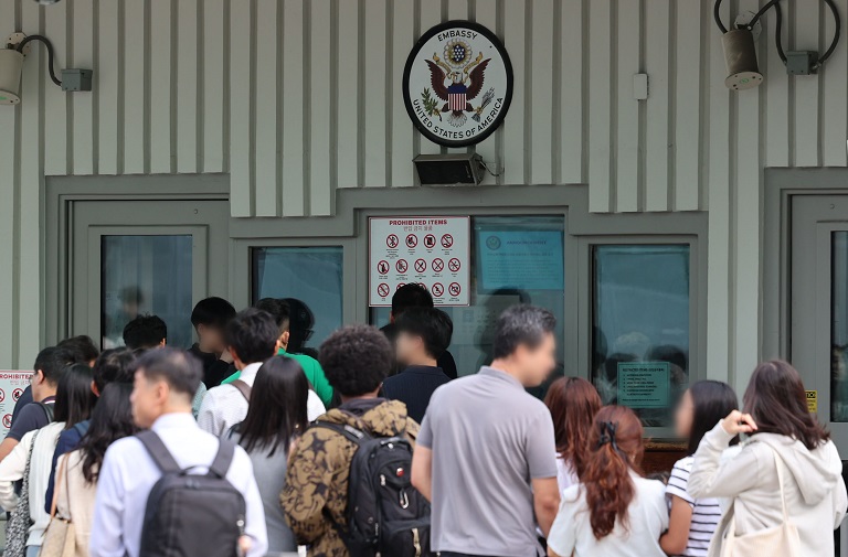 ¡ã¼¿ï Á¾·Î±¸ ÁÖÇѹ̱¹´ë»ç°ü ¾Õ¿¡¼ ½Ã¹ÎµéÀÌ ¹Ì±¹ ºñÀڽɻ縦 ¹Þ±â À§ÇØ ÁÙ ¼ ÀÖ´Ù. (»çÁø=´º½Ã½º)